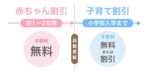 | サービス名 | 赤ちゃん割引の内容・期間 | 手数料無料条件 | 割引期間の長さ | 子育て世帯向けその他特典 |