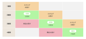 - カタログ到着:初回配達週にカタログと注文用紙、5週間半額特典の案内が届きます