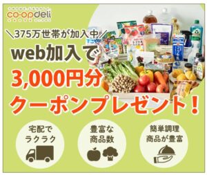 コープデリにWEBから加入すると、3,000円分のクーポンが3回に分けてもらえます。加入後の3週目、4週目、5週目にそれぞれ1,000円引きクーポンが配布され、5週間の半額特典と併用できるため非常にお得です。