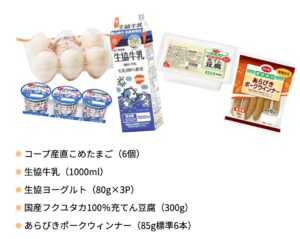• お試しAセット(500円):牛乳、卵、ウインナー、豆腐、ヨーグルトなど定番冷蔵品5品(約1,000円相当)