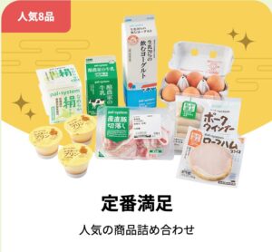 - 定番満足セット:卵・牛乳・豆腐など人気商品8〜9品入りで、初めての方におすすめ