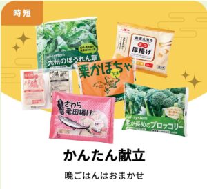- かんたん献立セット:カット済み食材とレシピ付きで、20分で4食分が完成する時短向け
