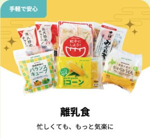 | 離乳食(yumyum) | 6品 | うらごしコーン、野菜キューブ、柔らかうどん、煮チャーハン、餃子、さば | 赤ちゃん+大人用。離乳食期の親子家庭に。 |